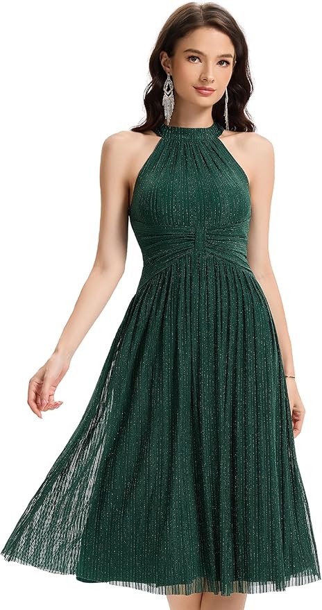 Ever-Pretty Women’s Summer Halter Sleeveless Pletaed Midi Glitter Formal Evening Gowns 41962
